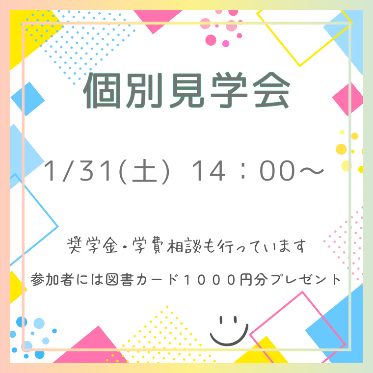 1/31(土)14:00~16:00(1時間程度) 個別見学会を開催します。詳しくはこちら。